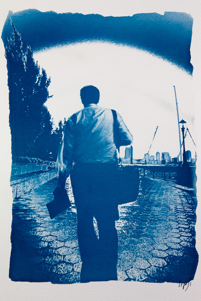 format, cyanotypes. Je profite maintenant du mix des deux mondes. Démarche sur la sérei : "Back(s) from...". Au fil de mes pérégrinations et de mes voyages, je récolte des images de gens que je suis dans la rue. Le dos. A priori une des parties du corps les moins photographiées. j'ai découvert que dans l'anonymat de ces dos, des styles, des démarches, des histoires singulières ou communes peuvent se détacher et avoir leur propre vie loin de la singularité du visage de leur propriétaire."